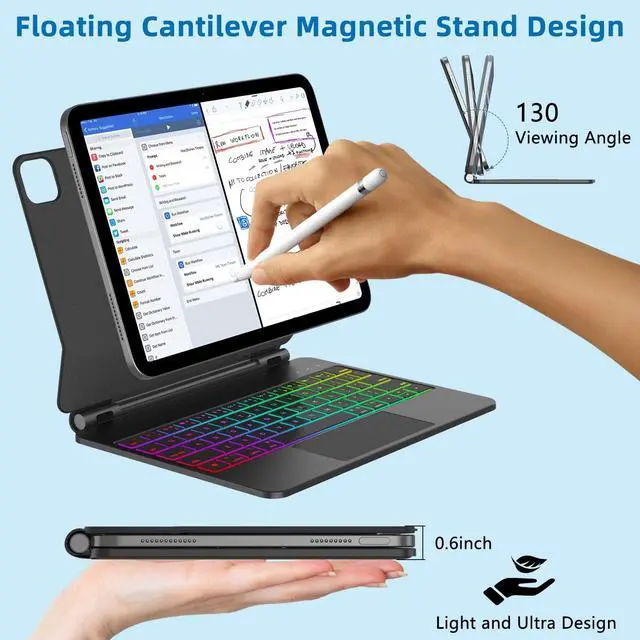 Air: It with a built-in precision trackpad that can quickly and easily navigate your iPad. Full multi-touch gesture support lets you redefine productivity by allowing you to edit documents, build presentations, and browse the web with unparalleled speed. It also with a full row of iPadOS shortcuts, to adjust brightness levels, volume or change your music with one tap. ^^ 11-color Backlit Keyboard for iPad ProFrom dawn to dusk, adapt effortlessly! Adjusting 11 backlight and 3 levels of brightness ensures clear visuals in every setting, enhancing your immersive experience. Work daily for 3 months or nightly for 2 weeks on a single charge then recharge quickly with convenient USB-C charging.