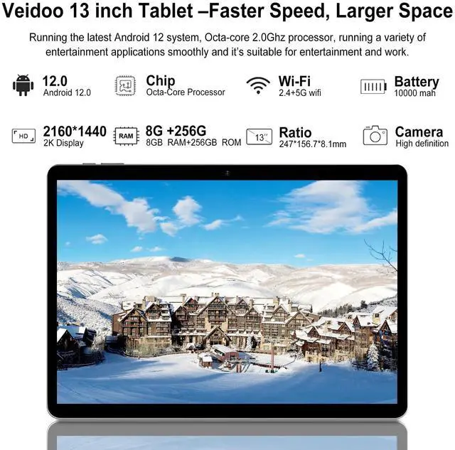 13 inch+2K full view resolution+ four speakers Veidoo 13 inch tablet features a 2160x1440 built-in screen, allowing you to achieve satisfactory resolution from any angle, automatically adjusting screen brightness, and providing you with a better visual experience. On Android tablets, we provide you with high-definition videos and four speakers at any time, allowing you to watch movies in person. ^^ Latest Android GMS CertificationVeidoo tablet is equipped with a new generation of Android operating system that runs faster than Android 12. The pre installed Google Play store allows you to download all your favorite applications, such as Facebook, Netflix, YouTube, Zoom, and more.