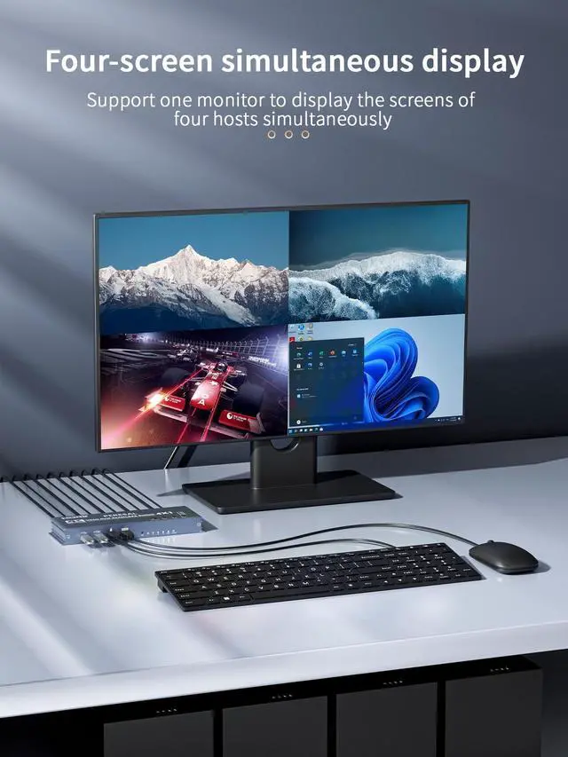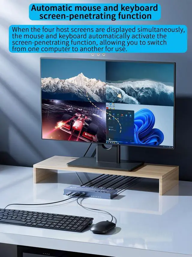 4 Port HDMI KVM SwitchThe HDMI kvm switch 4 port allows 4 computers to share one monitor and 4 USB 3.0 devices, One set of keyboard and mouse to control 4 computers at the same time. Support mouse crossing & roaming in 4 Equal Screen Mode. avoid frequently plugging and boosts office efficiency ^^ 4 in 1 Out Seamless HDMI MultiviewerEnjoy 9 display modes on