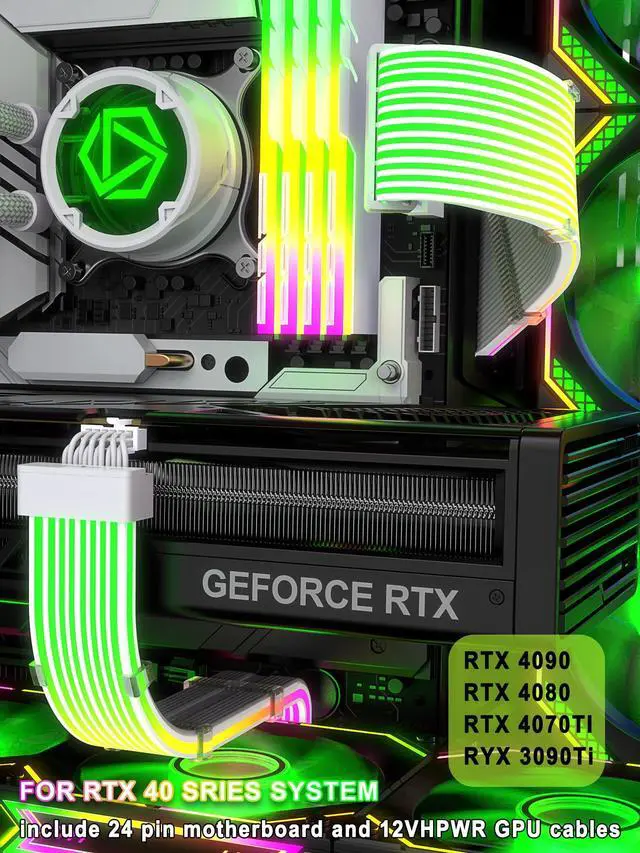 Experience a new level of gaming aesthetics with the Sirlyr RGB PSU cables! Designed for vibrant colors and customizable lights, these cables add a stylish touch to your gaming setup. With enhanced flexibility and easy installation, managing your cables has never been easier. This set includes a 12VHPWR extension kit to extend and enhance your original power supply cables, 16AWG wire core ensure stable performance during gaming. The 12VHPWR RGB GPU cable supports up to 600w output, compatible RTX 4070ti 4080 4090 graphic cards (extend and decor the modular PCIe 5.0 cable of ATX 3.0 power supply )