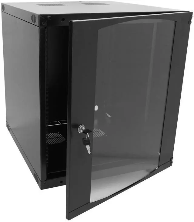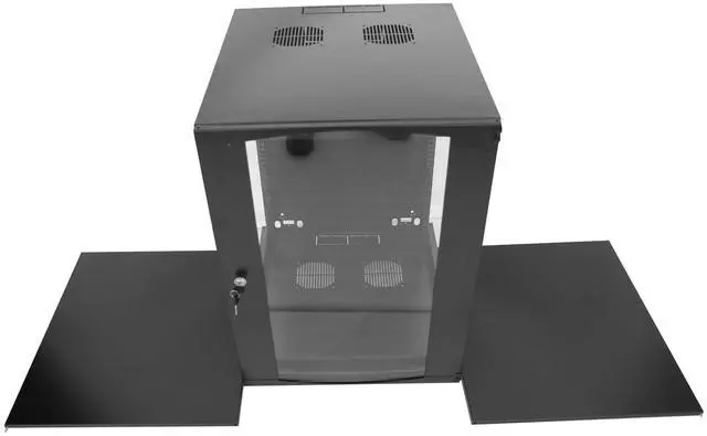 ^^ DESIGN AND VENTILATION: server rack cabinet removable door and side panels with vented top allowing airflowContains two fans, lockable tempered glass front door not only boosts security but also facilitates easy monitoring of installed equipment.