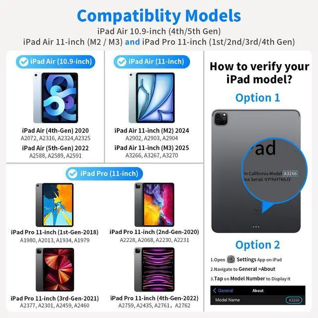 M2 (Model: A2902, A2903, A2904), 2022 iPad pro 11 inch 4th generation (Model: A2435, A2759, A2761, A2762), 2021 iPad pro 11 inch 3rd generation (Model: A2301, A2377, A2459, A2460), 2020 iPad pro 11 inch 2nd generation (Model: A2068, A2228, A2231), 2018 iPad pro 11 inch 1st generation (Model: A1934, A1979, A1980, A2013), 2022 iPad air 10.9 inch 5th generation (Model: A2588, A2589, A2591), 2020 iPad air 10.9 inch 4th generation (Model: A2072, A2316, A2324, A2325) ^^