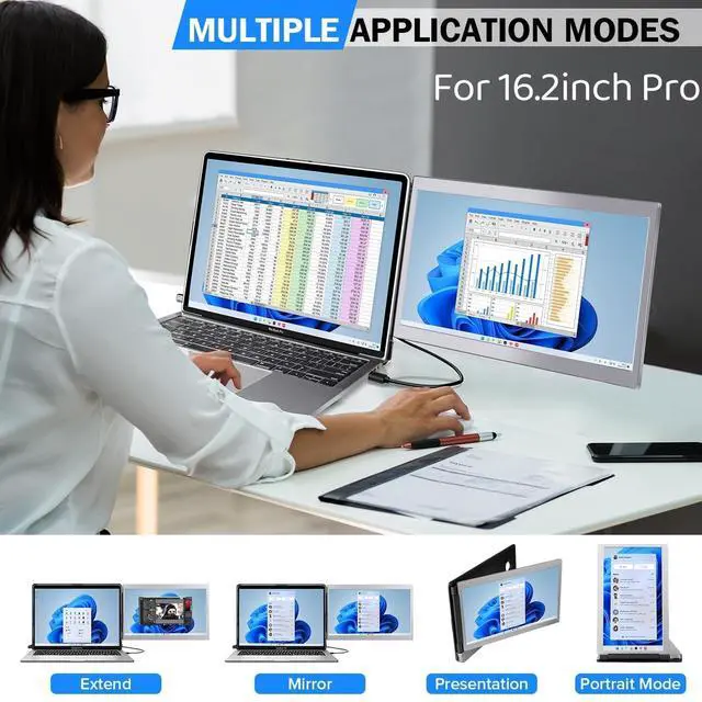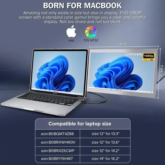 Born for MacbookDesigned specifically for your 16.2 inch MacBook, Copgain's dual-screen extenderseamlessly fits onto your laptop shell like a second skin. lt can be securely attached usingremovable nano-adhesive, allowing for easy integration of the dual monitor with yourMacBook, effectively becoming a second FHD IPS screen that will enhance your MacBook'sfashion and functionality. ^^ Mutilple Usage ModesThe 14-inch laptop monitor extender, you will have access to additional screen display modes: mirror, extend and presentation, portrait, no longer need to worry about frequent page switching, no more mutiple tabs, each screen has their own missions. Additionally, you can also connect the second screen to your Swith, PS5 or mobile phone get more fun for your life and work. ^^ Plug and Play No need driver no compitible issue, build-in type-C cable directly connecting with your Macbook, no need to take cables super conveinet and lightweight. Aad an extra type-C port which you can connect with your Swith, PS5 or mobile phone, also it has build-in HF speaker to help you to get better movie or game perceptual experience. ^^ Simplify and Classic Design Ultra fit shell case With magnetic function, portable laptop monitor can be folded and adsorbed on your macbook, It become safe to place your mac and Mac monitor extender into a backpack, or carry them anywhere, it also come with the aluminum alloy and PU pad are the ideal protection boards for the Copgain dual screen display. These two detachable pads can be your mouse pad or coaster.