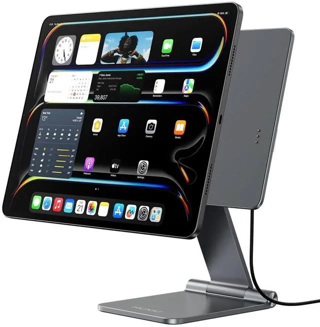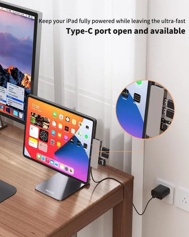 World's First Magnetic Charging Stand for iPadThe new version tablet stand added Pin Smart Connectors on the magnetic plate and a USB-C port on the back. So now, you simply place the tablet on the magnetic holder, and connect the original charging adapter and included 1M USB C cable, it instantly begins to charging for iPad. The Pin Smart Connectors allow for up to 18W fast charging for iPad, ensuring your devices stays powered up at all times. ^^ Foldable & 360 Adjustable Stand This KU XIU magnetic stand holder for desk support folding and multi-angle adjustment.