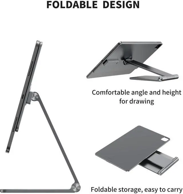 It has two hinges, the upper hinge supports 360 rotation in the horizontal plane, allowing your tablet to easily convert between landscape and portrait, and the magnetic suction panel can be turned 180 on the front and back around the bearing. The lower hinge can adjust the front and rear folding angle and sight height. It's convenient to carry when folded for travel. ^^ Sturdy Aluminum Alloy MaterialThe portable stand for iPad Pro is made of aircraft-grade aluminum alloy, by CNC high-speed machining process, sandblasting and anodic oxidation treatment, increases the surface texture and durability.