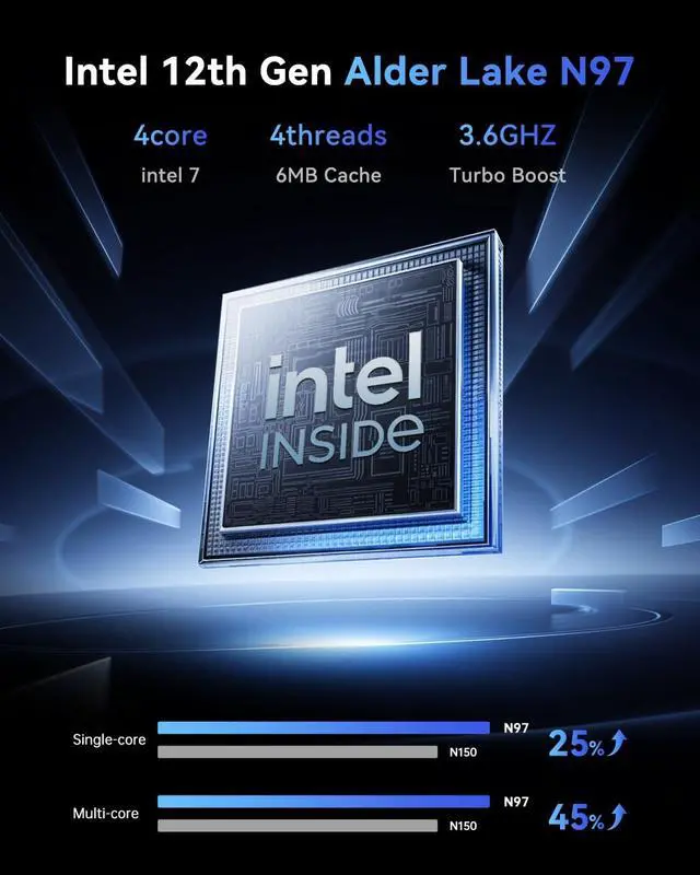 POWERFUL N97 CPU - 11 Pro Mini pc is powered by Alder Lake N97 processor (up to 3.6GHZ, 4 cores and 4 threads), which is 45% higher performance than N150, N100, N95. The processing speed is lightning fast, you can easily handle heavy tasks, office or multitasking without lag.