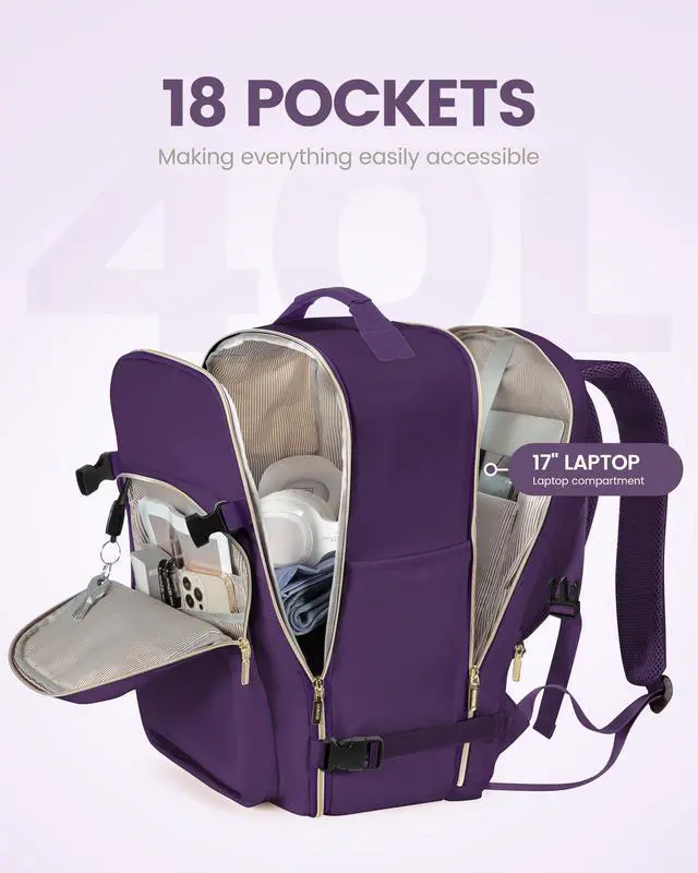 • Large Capacity with Multiple Pockets: The travel backpack for women with a 40L capacity and 4 main compartments, this travel backpack can meet both your daily and travel needs. It can easily accommodate all your items for a 3-5 day trip.