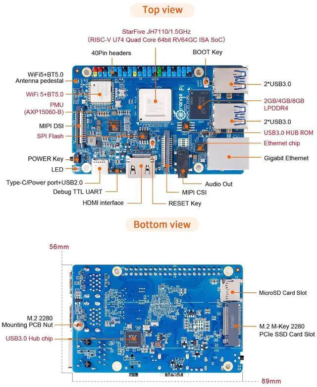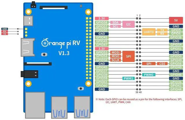 265) up to 1080p@30fps, support multi-way encoding; provide JPEG codec. ^^ Wi-Fi 5+BT 5 - Orange pi RISC V SBC supports PCIe 2.0, Gigabit Ethernet, MIPI-CSI, MIPI-DSI, 40Pin expansion interface and other commonly used functional interfaces, and supports Linux operating system. ^^ Enriched interfaces - Rich peripheral interfaces, including PCIe 2.0 interface, USB 3.0 interface, Gigabit Ethernet interface, Wi-Fi and Bluetooth, MIPI DSI, MIPI CSI, 40Pin expansion port, 3.5 mm headphone jack, Type-C 5V4A power supply (not included) and so on.