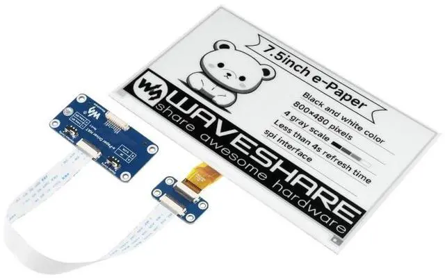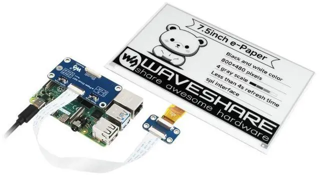 7.5" e-Paper HATlow power consumption, wide viewing angle, paper-like displaying without electricityFeatures at a glance: No backlight, keeps displaying last content for a long time even when power downUltra low power consumption, basically power is only required for refreshingStandard Raspberry Pi 40PIN GPIO extension header, supports Raspberry Pi series boards, Jetson Nano, RDK X3SPI interface, for connecting with controller boards like Raspberry Pi/Jetson Nano/RDK X3/Arduino/STM32, etc. nboard voltage translator, compatible with 3.3V / 5V MCUsComes with online development resources and manual (examples for Raspberry Pi/Jetson Nano/RDK X3/Arduino/STM32)Advantages of