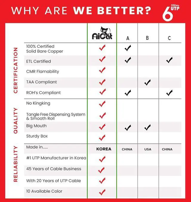 CERTIFIED AND TRACEABLE: All Ai Cat. Cables are CSA and ETL Certified, TAA and RoHS Compliant, and CMR flame resistant (IEC 60332-3 Cert). Each unshielded internet cable is part of a detailed lot tracking system, barcode traceable and comes with a full guarantee. When you order now, youll be joining thousands of companies around the world who rely on Ai Cat