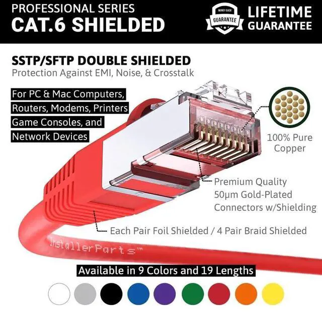 Shielded CAT6 Cable: InstallerParts SSTP / SFTP (Screened Foil Twisted Pair) patch cables are doubled shielded with an overall braided screen and foil screened twisted pairs for the best prevention of noise, electromagnetic interference and crosstalk. ^^ High