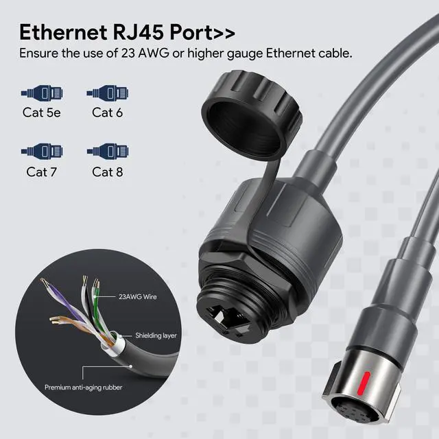 ^^ *Easy Installation Guidelines: For optimal performance, use a single Cat6 or higher Ethernet cable without any couplers or extenders to minimize contact resistance. The recommended maximum cable length is 175 feet (50 meters). If you're using crimped cables, ensure the RJ45 connectors are securely attached. When installing the waterproof socket, handle cable ends carefully to avoid twisting or damage.