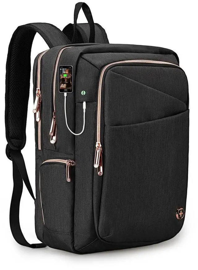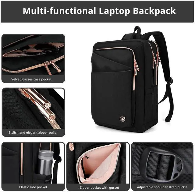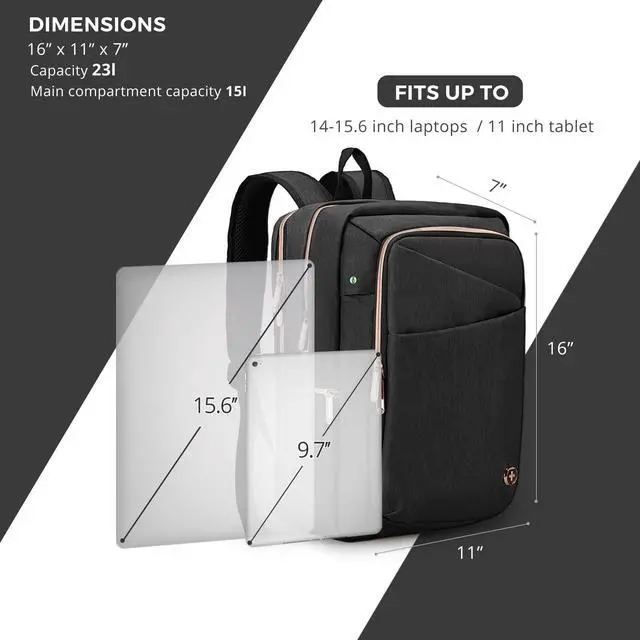 MEDIUM CAPACITY & MULTI-POCKETThe Katy Rose 23L travel laptop backpack incorporates 4 separate compartments to give you organization of your belongings. Main Compartment accomodates a 15.6 inch laptop computer. Second pocket is for notebooks, tablets and clothes or shoes. Front pocket is for the safe keeping of your keys, wallet, pens and business cards ^^ STYLISH PROTECTIONWomen backpack made with high quality materials and Swiss Design to provide both style and protection for your belongings. The velvet lined sunglass pocket gives your sunglasses comfort and protection. An RFID pocket protects your credit cards, driver's licenese and passport from electronic snooping ^^