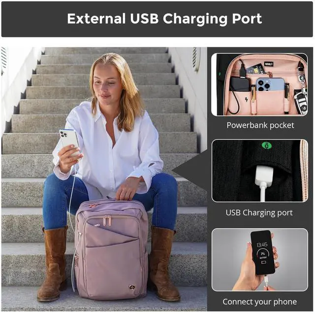 ALL DAY COMFORT: Adjustable padded straps provide the right women's computer backpack fit to give you comfort all day. The added USB Charging Port provides quick access to charge and use your phone and other USB devices while walking (A powerbank is not included. A special powerbank is not required. Built-In Water Bottle holder provides you with easy storage to stay hydrated throughout your day ^^