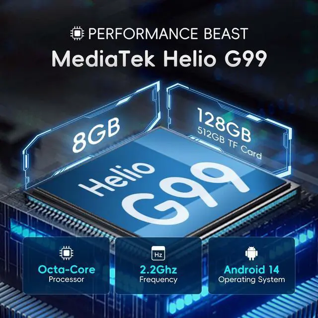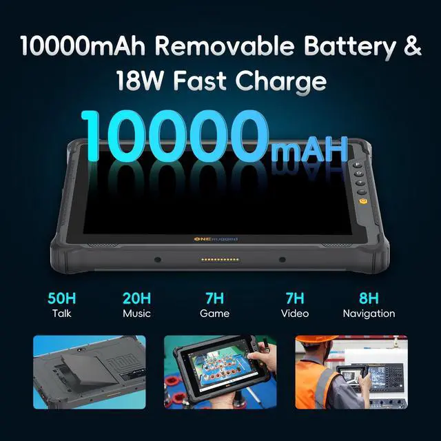 [ IP65 + MIL-STD-810H ] - Professionally certified with IP65 & MIL-STD-810H tested, it can withstand accidental drops from up to 4 feet, powerful water jets, extreme temperatures, moisture and dust without any damage. This industrial tablet is perfect for fieldwork, construction sites, warehouses and explorers, ensuring efficient task accomplishment in challenging environments ^^ [ Octa-Core CPU, 8GB RAM+128GB ROM/512GB TF ] - The ONERugged heavy duty tablet is equipped with an upgraded Android 14 OS and adopts a 2.2GH z high-speed MTK Helio G99 Octa-core processor, delivering stable and efficient performance even while multitasking.