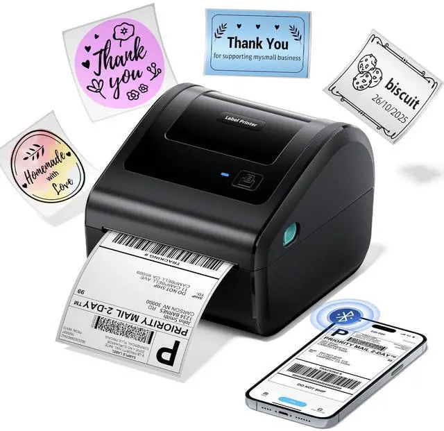 Note: only thermal paper can be printed. ) The printing speed of D450BT bluetooth thermal label printer can reach up to 150mm/s (average 72 4"x6" labels per minute), enhancing the efficiency of handling large volumes of packages and saving a ton of time while do shipping. It has a 203 DPI clarity, ensuring that the labels are clear and sharp. D450BT is a fast, relaible, budget-friendly label printer for home and small business ^^ Compatible with Multiple Sizes Thermal LabelsThis thermal label printer prints labels from 0.78" to 4.4" wide. Idea for 4"x6" shipping labels and barcode/postal/bulk mailing labels ect. D450BT wireless thermal printer work with free app, offering an extensive collection of 800+ templates and abundant customizable elements for crafting personalized labels. The thermal label printer 4x6 supports printing of WORD, TXT, and PDF files ^^ Various Platforms CompatibilityThis label printer for small business compatible with most major shipping platforms including Shopify, Etsy, eBay,, Poshmark, Fedex, USPS, ShipStation, ShippingEasy, Shippo, Ordoro, etc. With the ups label printer starting your small business easily ^^ Professional Technical SupportThe package includes a comprehensive user guide.