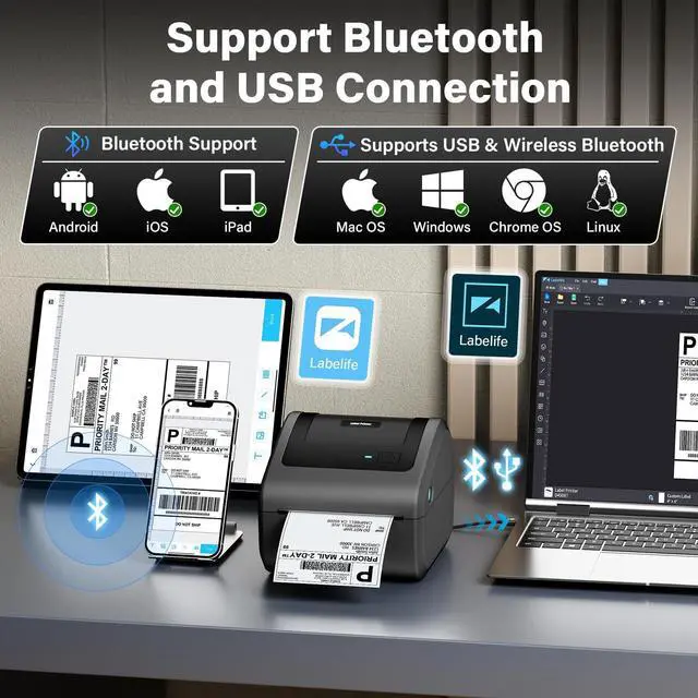 Easy to Set UpThis shipping label printer supports both bluetooth and USB connection. For bluetooth connection, it is compatible with Android/iOS/Windows/macOS/ChromeOS system and provides a stable connection within a 5-meter range.