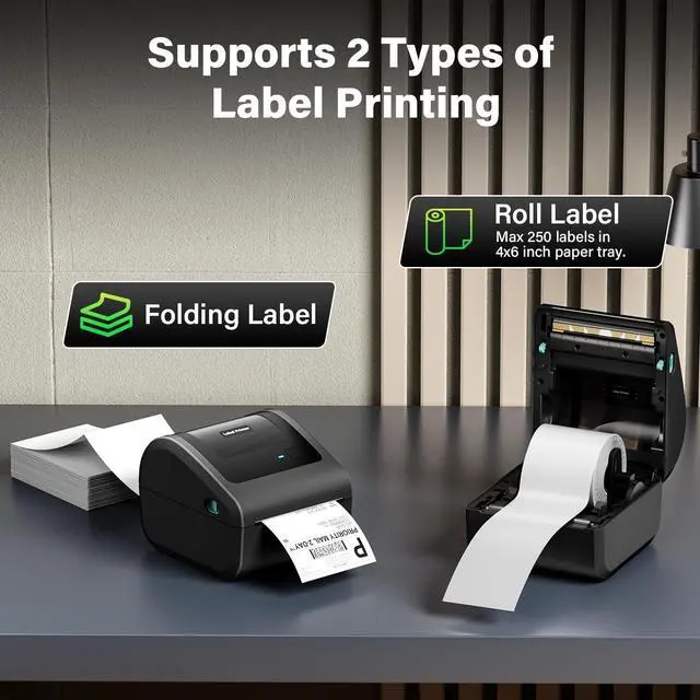 (Note: all devices must be connected via the app) Also you can connect the 46 label printer to PC via USB cable. For PC printing, this 46 shipping label printer supports Windows, Mac OS, Chrome OS and Linux systems ^^ Compact and Practical DesignThis label printer supports both folding labels and roll labels. D450BT thermal shipping label printer holds up to 250 labels in its built-in tray, which means you dont need an extra holder. The compact design of 46 thermal printer make it perfectly fitting any working environment, saving costs while effectively keeping your workspace tidy ^^ Fast and High Clarity PrintingThis thermal printer adopts advanced thermal printing technology, no need for additional toner or ink cartridges.
