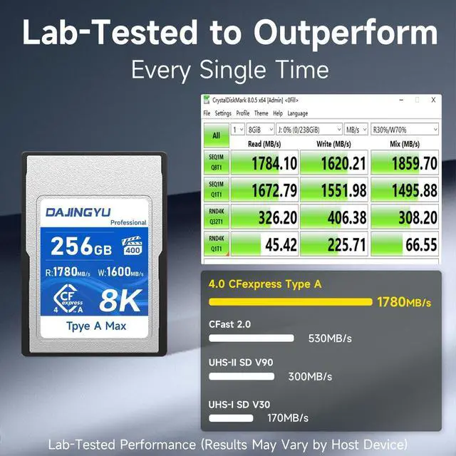SPEED RATING: With lightning-fast read speeds of up to 1780 MB/s and write speeds of up to 1600 MB/s, this CFexpress Type A card is built for professionals who need top-tier performance. Perfect for high-resolution photography, 8K video recording, and rapid data transfers, it ensures you never miss a shot or frame. ^^ VPG400 Certified for Flawless 4K 120P/8K 30P