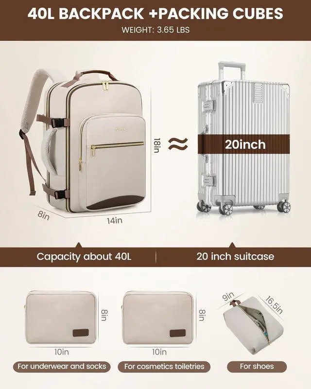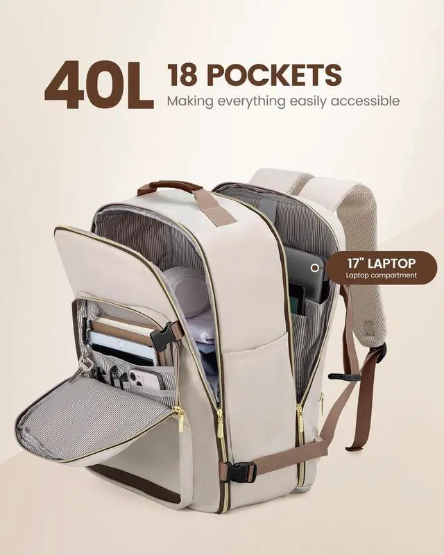 Large Capacity & Multiple Pockets: The travel backpack has a 40L large capacity and 4 main compartments, which can meet daily and travel needs. The travel backpack for women's main compartment can store a lot of things, including 5-8 pieces of clothing, shoes, books, and many other items. The separate laptop compartment is padded with EVA foam to provide the best protection for your 17" laptop and 12.9" iPad. The front compartment has many pockets to keep your belongings organized. ^^