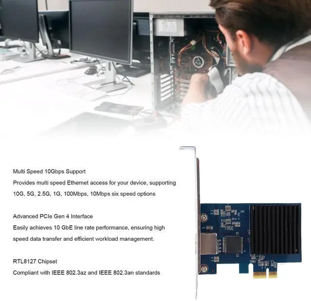 ^^ Robust Chipset: Equipped with the RTL8127 chipset, this PCIe network adapter supports IEEE 802.3 az and IEEE 802.3 an standards, offering a highly efficient PCIe 4.0 interface that enhances overall network performance while minimizing energy consumption.