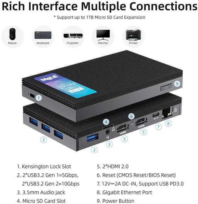 2 NVMe 2280 SSD to upgrade the storage to 4TB (excluded). It also comes with a Micro SD card slot separately to expand the storage up to 2TB. ^^ Faneless, Pocket Size and Portable DesignComing with a fanless technology with 0dB noise that offers a silent and comfortable experience when working. The palm-size designed computer can be put into a pocket and easy carry out for a business trip. Besides, the desktop pc comes with a VESA mounted bracket, you can hang it on the back of a TV or a monitor.