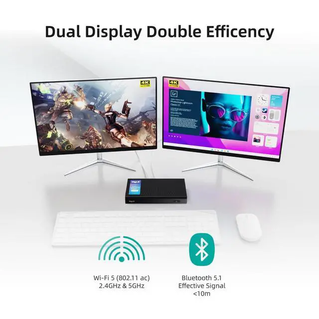 ^^ Stable 2.4G /5G WiFi & Fast BT 5.1T he slim desktop computer is equipped with the latest wireless connectivity 802.11 ac which offers speeds up to 1.7G bps. Built-in Bluetooth 5.1 enables you to connect multiple wireless devices such as mice, keyboard, printer and monitor. High-speed wireless connection technology, reliable and efficient transmission speed, providing a faster internet experience for browsing and streaming. ^^ 24/7 Continuous Operation & Low Power ConsumptionThe MeLE Quieter 3Q micro pc supports 24/7 uninterrupted and continuous operation. And the MeLE mini pc has very low power consumption so that it can save a lot of energy and is very environmentally friendly, totally a great slim alternative to a traditional tower pc.