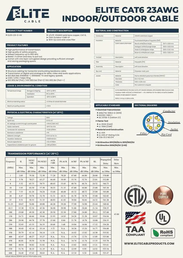 Elite Cable introduces the most advanced Cat6 cable in the market. Built for indoor and outdoor installation our cable covers it all. More insulation, Better Speed, Safer cable, We build our cables for you!