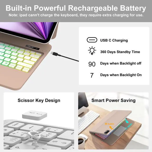 The floating cantilever stand design allows you to easily adjust the angle of iPad. Whether it is typing, watching videos or making video calls, you can find the most suitable angle to meet the needs of different usage scenarios ^^ Bright Rainbow BacklightThe magic keyboard for ipad air 13 has Rainbow backlit with 7 combinations. Click"Fn and Light "key together to adjust 3 different levels of brightness, ensuring comfortable use under different lighting conditions. Click "Fn and RGB" key together to switch color of backlight. After click them 7 times, it will switch to breathing light mode, the backlight color will automatically switchincreasing fashion sense of the keyboard while providing a better typing experience ^^ Large-capacity Rechargeable BatteryAfter strict quality testing, the ipad air 13 inch case with keyboard is equipped with the long-lasting 800mAh battery, provides a working time up to 320 hours and standby time up to 1500 hours on a single charge. The smart wake-to-sleep function helps save battery power and extends the battery life ^^ Stain-Resistant SurfaceThis ipad pro 12.9 keyboard surface is made of stain-resistant material that can resist daily dirt and fingerprints, which means you don't have to worry about the keyboard surface getting dirty during busy work or travel, making it easy to maintain.