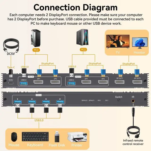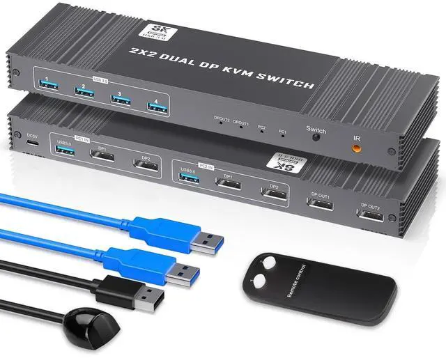 Two Switching Methods: Support panel buttons and IR control 2 ways to switch. This dual displayport KVM switch requires 2 display port output ports per computer and supports
