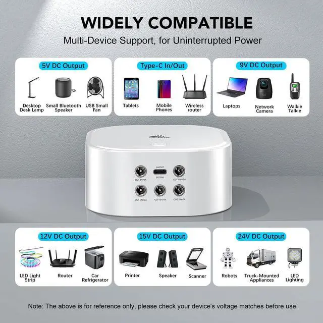 PD30W Multi-Voltage Output:Supports switchable DC output at 5V / 9V / 12V / 15V / 24V, plus USB-C PD30W bidirectional input & output.Recharge the UPS faster or power compatible devices such as routers, ONT, LED lights or Raspberry Pi. Please confirm voltage before use.