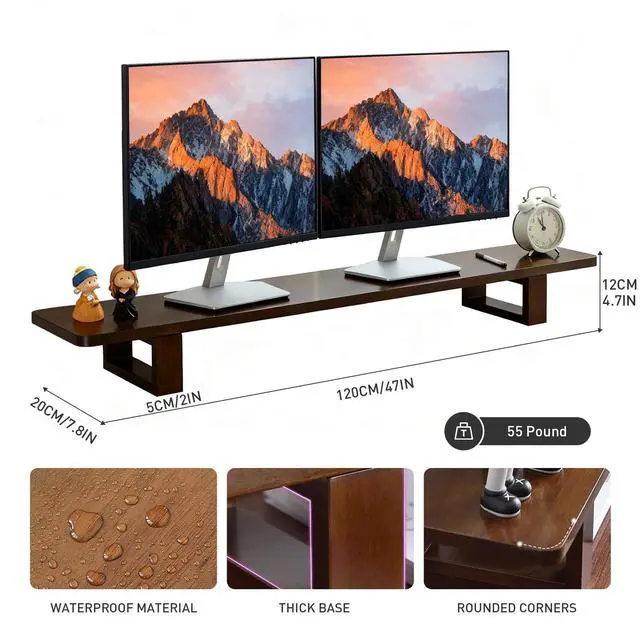 Maximize Your Workspace & Stay Organized This expansive Lengthened 47-inch solid wood monitor stand riser elevates your dual monitors to a perfect ergonomic height, reducing neck and eye strain. The vast desktop real estate underneath provides clever storage for your keyboard, laptop, printer, notebooks, and other office essentials, keeping your desk tidy and clutter-free. ^^ Premium Solid Wood Construction Crafted from high-quality solid wood with a beautiful natural walnut finish, our monitor stand is far more durable and stable than particleboard or MDF alternatives. It offers a sturdy, reliable base for your expensive equipment and adds a touch of warm, modern elegance to any home office, gaming setup, or studio.