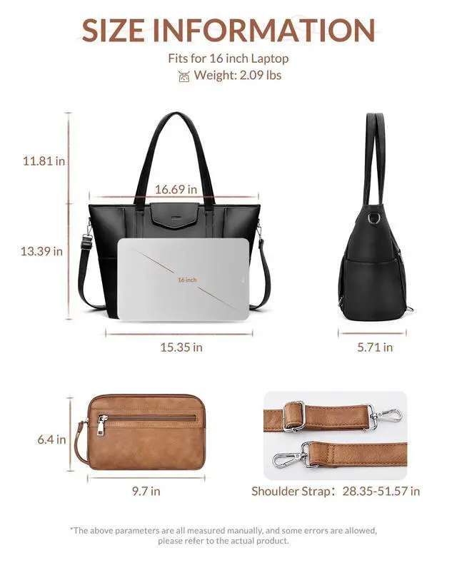 It can hold laptop, clothes, magazines, A4 files, keys, passports, phones and other items. The multi-pockets design keeps your everything in good order ^^ Comfortable Size- The laptop tote bag size: 16.69" - 15.35" W * 5.71"D * 13.39"H, weights 2.09 lbs with adjustable & removable 28.3551. 57"shoulder strap.