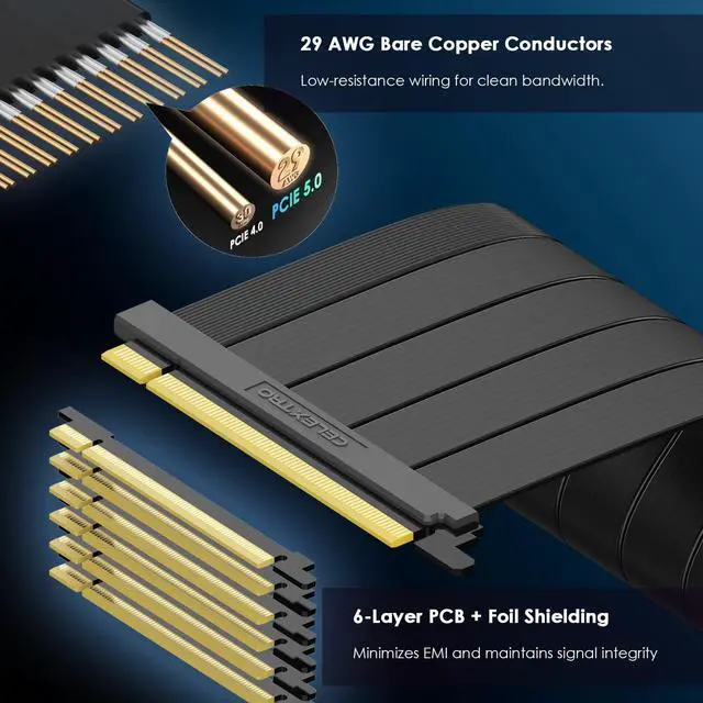 ^^ Bare Copper Wires + Gold-Plated ContactsBuilt with 29 AWG bare copper conductors for superior signal transmission, and gold-plated edge connectors to ensure corrosion resistance and long-term contact reliability. ^^ Low-Profile Riser Cable with Flexible Flat DesignThe ultra-flexible flat cable supports up to 180 bending, enabling clean routing through tight enclosures, behind motherboard trays, or around airflow-sensitive components. The compact connector structure and traditional soldered interface make it ideal for vertical GPU setups and space-optimized builds. ^^ 6-Layer PCB & EMI Shielding for Clean Signal FlowBuilt with a 6-layer PCB and individually shielded differential pairs using foil-wrapped EMI design.