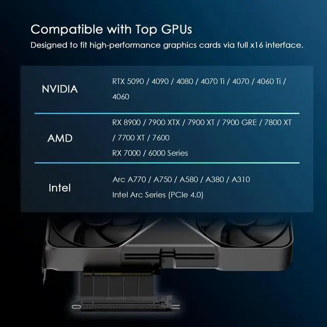 128GB/s Bi-Directional PCIe 5.0 BandwidthUnlock the full potential of your GPU or Gen5 NVMe SSD with 128GB/s bi-directional throughput. Supports full PCIe 5.0 / 4.0 / 3.0 x16 bandwidth and fits most desktop PCs and workstations with x16 slotsincluding ATX, E-ATX, and SFFfuture-ready for high-end GPUs and Gen5 SSDs. ^^ Up to 72W Power via 164-Pin PCIe x16 ExtensionDelivers stable power with dedicated 12V and 3.3V lines, shared ground path, and full 164-pin supportmaking it ideal for high-power GPUs such as RTX 4090 or RX 7900 series. A reliable graphics card riser cable solution for workstation or gaming setups.