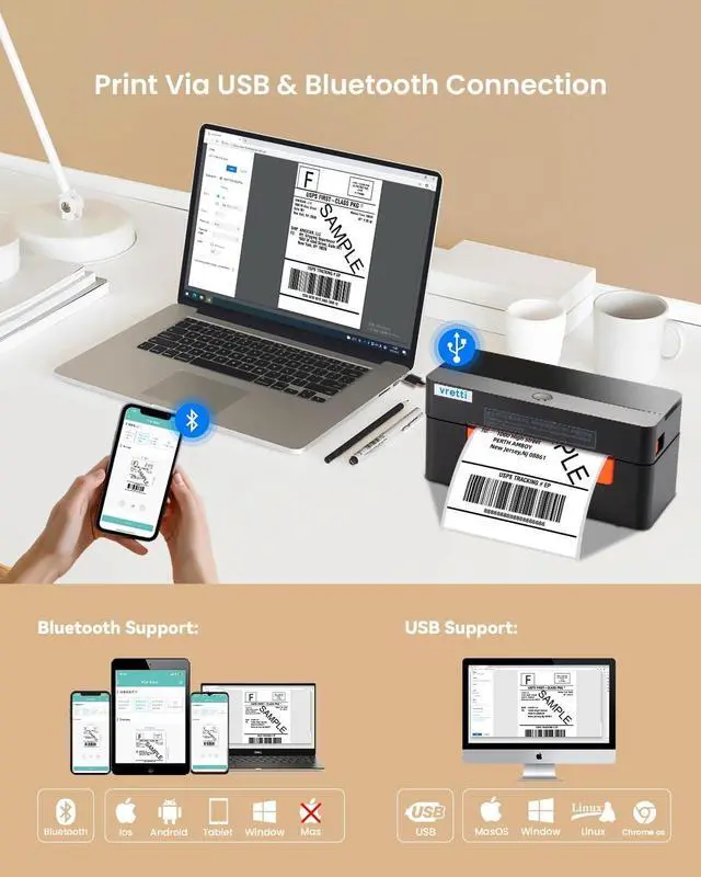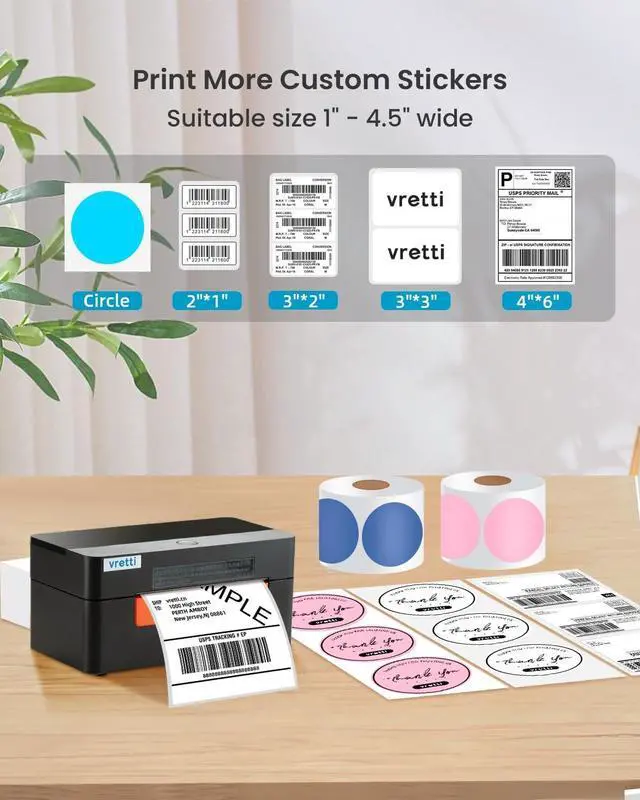 ^^ Support Various SizeVRETTI Bluetooth thermal label printer support to print a lot of sizes, such as 4"x6", 4"x3", 3"x2", 2"x1", etc. The thermal shipping label printer can be it as shipping labels, address labels, barcode labels, logo stickers, Create your customized labels! ^^ Platforms CompatibilityThe label printer 4 x 6 works with most sales platforms including USPS, UPS, eBay, Esty, Shopify,, PayPal, etc. Choosing our bluetooth label printer can help you better handle your company's work.