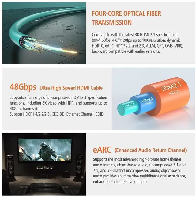 HDMI Cable: Supports the full range of uncompressed HDMI 2.1 Specification features including 8K video with HDR, Enables up to 48Gbps bandwidth ^^ Supports the most advanced high bitrate home theater audio formats, object-based audio, uncompressed 5.1 and 7.1, and 32-channel uncompressed audio; Object-based audio provides an immersive multi-dimensional experience and enhanced audio detail and depth ^^ Wide Compatibility for