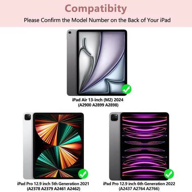 Model: Compatible only for iPads air 13 inch M2 2024 (A2900/A2899/A2898) for iPads Pro 12.9 inch 6th Generation 2022 (A2436/A2437/A2764/A2766) for iPads Pro 12.9 inch 5th Generation 2021 (A2378/A2379/A2461/A2462) these 3 iPads models. Please check your iPads model before placing an order.