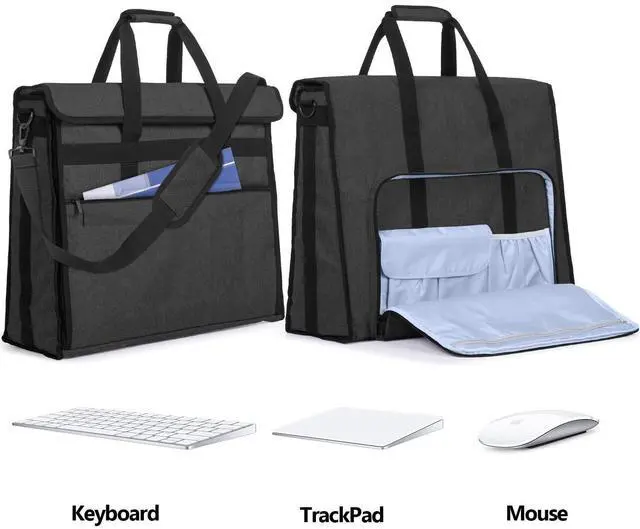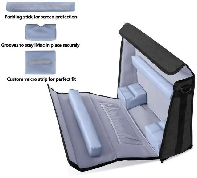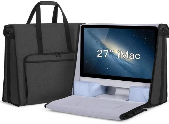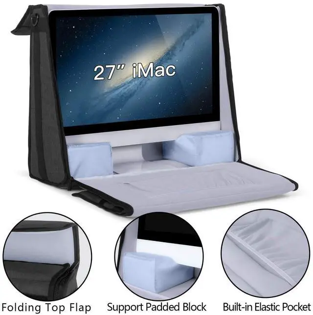 Specially designed to compatible with Apple* iMac* 27'' Desktop Computer. ^^ Support padded foam block to ensure your computer remain stationary. Adjustable panel reinforcement offer additional screen protection. ^^ The padded handle and adjustable shoulder strap can lighten the burden when carrying computer work on the go. ^^ Made of high quality and premium nylon material, keeps your iMac* away from dust, dirt and scratches. ^^ Built in many pockets for iMac* accessories, such as keyboard, mouse, track pad, and cables. (*Our Product is unrelated to brand referred)