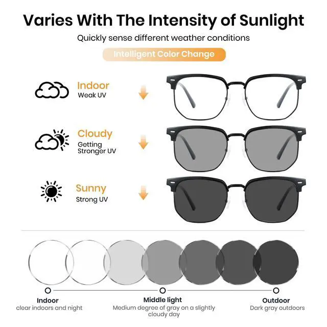 DescriptionExperience the ultimate in eye care and style with our Photochromic Blue Light Blocking Glasses. Featuring a sleek browline frame and photochromic lenses, these glasses adapt to light conditions, blocking harmful blue light and providing 100% UV protection indoors and outdoors. Designed for both men and women, they reduce eye strain from screens while adding a modern, versatile touch to any outfit. Lightweight and stable, these glasses are perfect for work, gaming, or daily wear a must-have for anyone who values fashion and functionality!