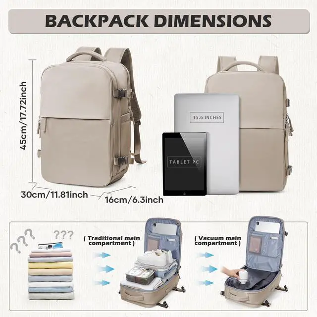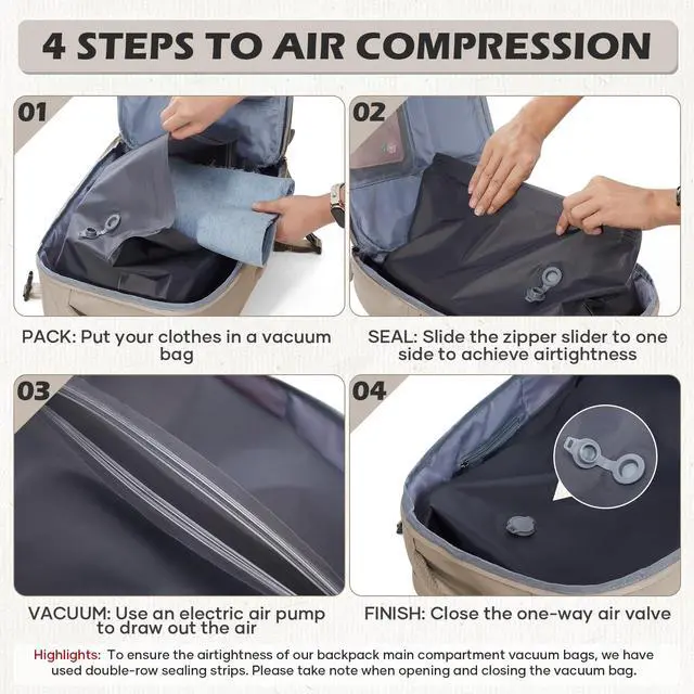 Strong Vacuum Compression: With a 40L capacity50% more than standard same-size backpacks (45x30x16CM / 17.711. 86.3", 3.5 lbs)it maximizes packing space. Includes a wired electric air pump with a US-standard plug. A unique zipper slider, pulled to one side, creates an airtight seal for efficient compression. ^^