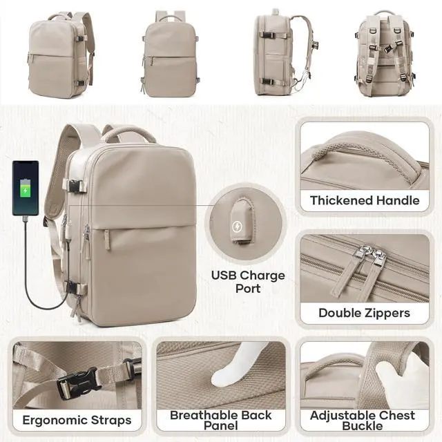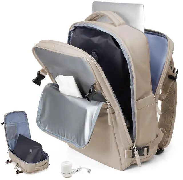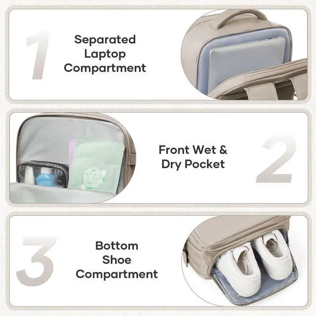 ^^ Multi-Pocket Organization: Beyond the spacious main compartment, there are front pockets, interior combo pockets, and a dedicated 17-inch laptop sleeve. Separate shoe compartment, wet/dry partition, and stretchy side pockets (for umbrellas/water bottles) keep belongings neat. ^^