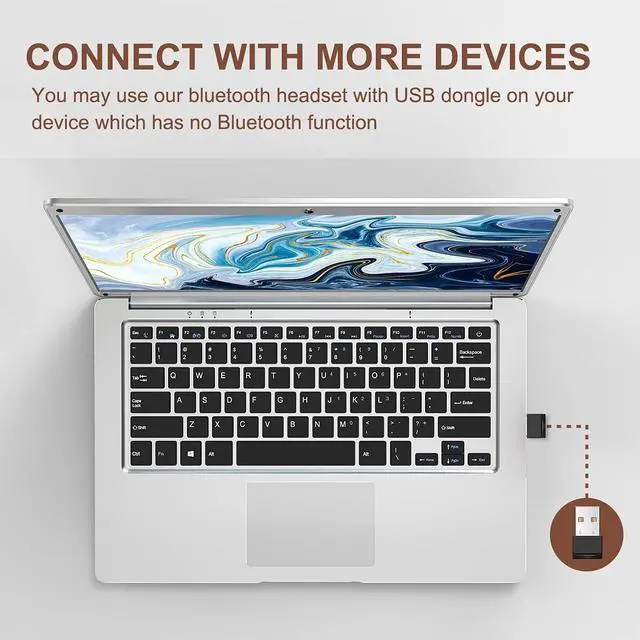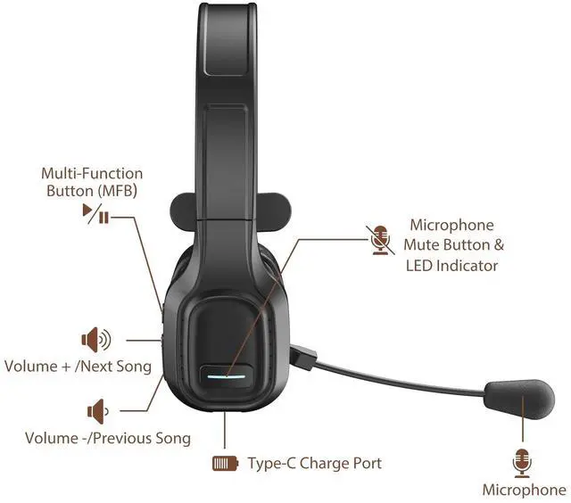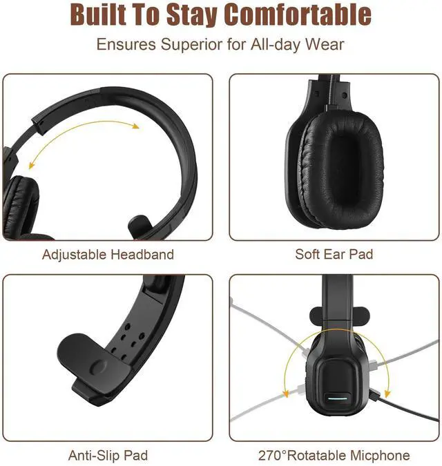 ^^ Extremely Comfortable To WearOur wireless headphones with microphone equipped with comfortable earmuffs and ultra soft protein leather for all-day comfort. 270 rotatable microphone can be used on the right or left side, through the MFB button on the Bluetooth wireless headset, you can easily answer or hang up calls (only useful for phone calls). NoteIf you want to answer or hang up calls from Skype, Zoom, or Teams on the PC side, please set it up through the software. ^^ Easy to Connect and Switching for Two DevicesOur Bluetooth headset adopts the Bluetooth 5.0 technology.