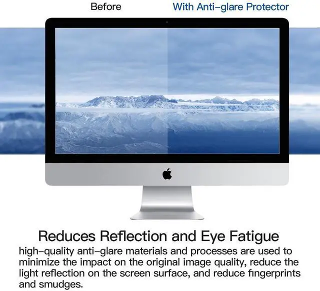 Compatible Model This anti glare computer screen cover is specially compatible with 21.5 Inch iMac All-in-Ones Desktop. Please verify your computer screen's length and width measurements before ordering. It's not recommended to make your selection based solely on your computer screen's diagonal size. ^^ Superior Anti-Glare Technology This iMac 21.5 screen protector utilizes advanced anti glare technology to effectively reduce glare and reflections caused by sunlight or bright environments. By shielding your eyes from the disruptive effects of glare, it also helps maintain the cleanliness of your computer screen. ^^ Scratch Resistant Design Equipped with advanced scratch-resistant properties, this iMac desktop screen protector 21.5 inch effectively safeguards your screen from scratches and damage.
