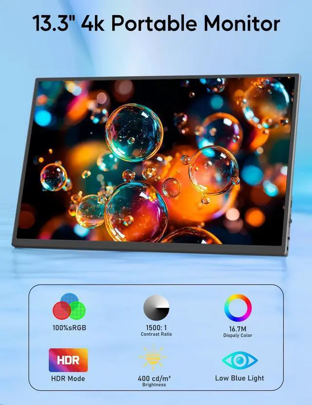 4K Portable MonitorOUNSHLI Portable Monitor equips 4K IPS panel technology, 3840x2160 pixels resolution, which is 4 times resolution of 1080P monitor, resulting in incredibly sharp and detailed images. it's good partner for graphic design, photo editing, or video production. ^^ 13.3