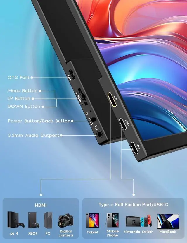 Monitor Stand: There is a 90 degree adjustable monitor stand on the back of the portable laptop monitor, you can adjust it according to your own needs. Additionally, this laptop extended monitor supports VESA with the standard 75x75mm VESA holes on the back and can be set to landscape or portrait mode as desired. ^^ Plug and Play, Ease to UseThis portable gaming monitor includes dual usb-c 3.1 full function port, a HDMI port, and a 3.5 mm headphone interface, widely compatible with most Laptops, PC, PS4, PS5, XBOX, Switch, Mac, etc. More importantly, The USB Type-C port enables you to power up and transmit signal with just one cable connection, realizing easy work anytime, anywhere.