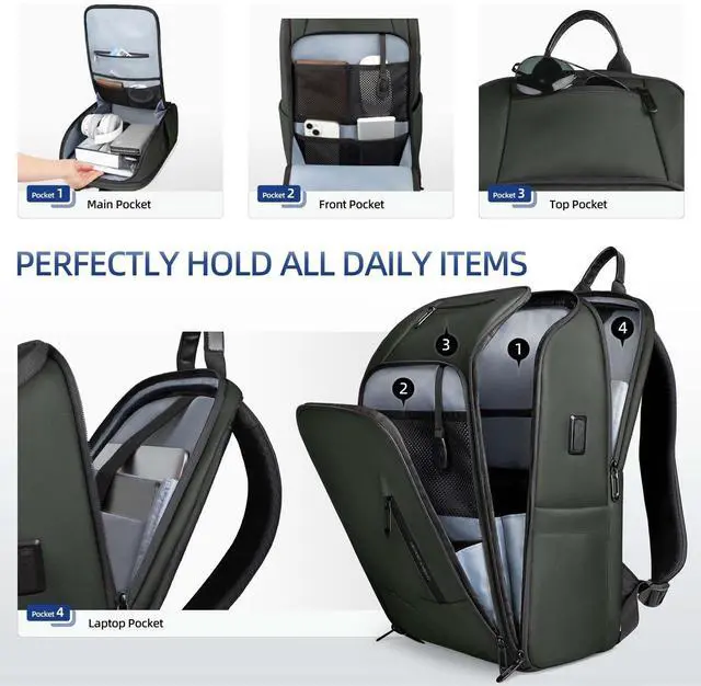 This way, you can always stay connected at work or on the go. It also offers a convenient way to charge your phone without opening the backpack ( Battery not included) ^^ Versatile Daily Backpack -- The top handle of the black bookbag is made of PU synthetic leather, which provides additional comfort when carrying. The luggage strap on the back of the Personal Item Bag allows you to attach the large men's backpack to your trolley. In addition, the device compartment of the men's office backpack is padded with thick foam, which protects your laptop from shocks due to accidental drops.