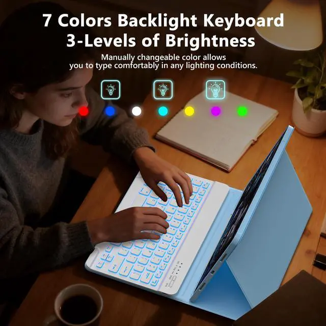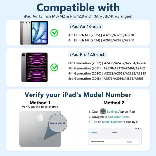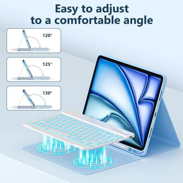 Wide CompatibilityThis keyboard case compatible with iPad Air 13 inch M3 2025 (A3268/A3269/A3271), for iPad Air 13 inch (M2) 2024 (A2900/A2899/A2898), for iPad pro 12.9 inch 6th Generation 2022 (A2436/A2437/2764/A2766), for iPad pro 12.9 inch 5th Generation 2021 (A2378/A2379/A2461/A2462), for iPad pro 12.9 inch 4th Generation 2020 (A2229/A2069/A2232/A2233), for iPad pro 12.9 inch 3rd Generation 2018 (A1876/A2014/A1895/A1983). Please check your tablet model before purchasing. ^^ Adjustable 7 Colors Backlit KeyboardThis for ipad air 13 inch case keyboard is adopted backlight and magnetic design. Backlight design makes it convenient to use even in a dark environment and offer visual enjoyment.