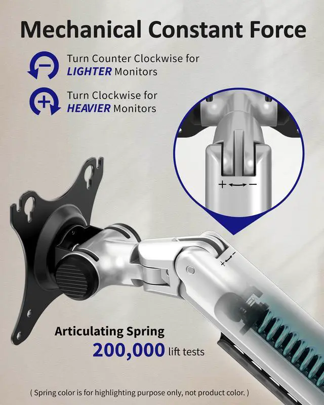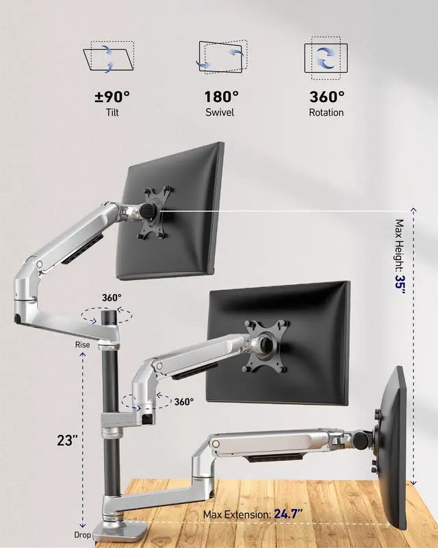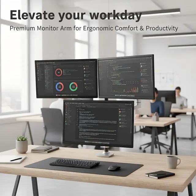VESA compliance: 100 x 100 mm and 75 x 75 mm from various brands. ^^ Two Mounting Options C-clamp fits desks between 2/5 and 2 2/5 inches, and the grommet base fits tables up to 2 1/4 " thick. Both mounting bases will provide powerful support for our devices. ^^ Premium Spring Arm E666 triple monitor arm features a flexible movement structure, enabling instant and effortless adjustments to achieve the optimal orientation for work. ^^ Maximize Desktop Space Since the long monitor arm offers swivel, tilt, and rotate adjustment, this 3 monitor stand can be retracted to the edge of the desk. Coupled with hidden cable management, a neat and functional workspace is always refreshing. ^^ Seamless Panoramic Setup for Any TaskEffortlessly align your monitors for an immersive, near-bezel-less panoramic view. Ideal for gaming, coding, stock trading, and video editing. Easily switch between landscape and portrait orientations to match your workflow. ^^ Benefit Ourself As an ergonomic desk monitor mount, it's not only easy to install but also promotes our health and doubles our office efficiency by achieving the comfiest working position.