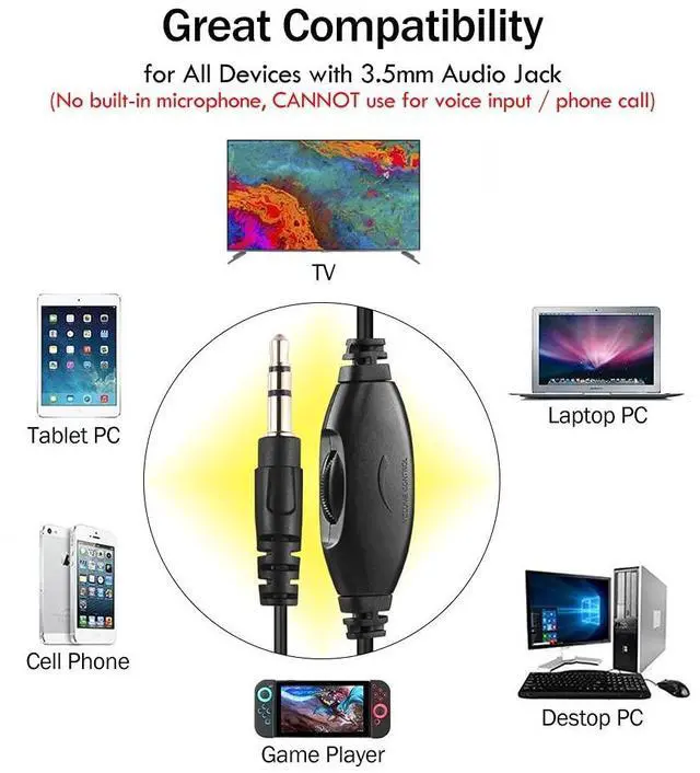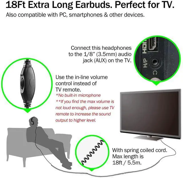 GREAT SOUND QUALITY: 2pcs of 40mm NdFeB speakers for crystal clear sound output, to enhance your immersive experience when watching TV. (The headphones is preset to Balanced audio output, NOT for bass enthusiastic fan. Please buy with understanding) ^^ CONVENIENT VOLUME CONTROL & NO MIC: You can use the in-line control to reduce or mute the sound just in seconds, instead of digging out the TV remote from the sofa gap. Be noted that there is no mic in this headphones, not for audio input / phone call. Supplied a cloth bag for neat storage. [The volume control CANNOT boost the TV volume. If you find the max volume is still not loud enough, you should increase the TV output volume to higher level] ^^ IDEAL CHOICE for